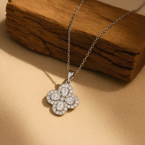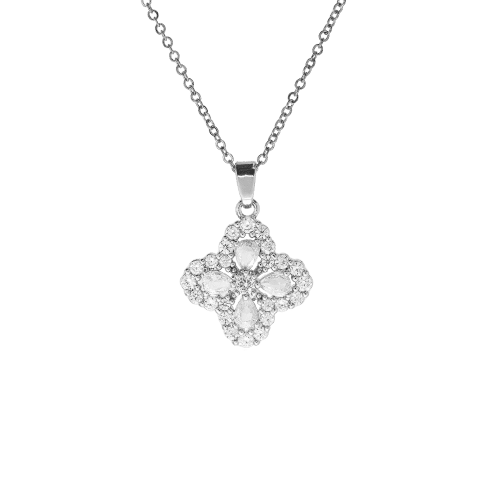Colar Pingente Flor Brilhante Cravejado Aço Prata