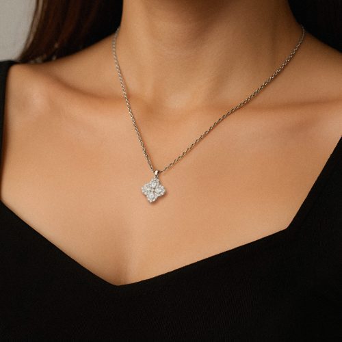 Colar Pingente Flor Brilhante Cravejado Aço Prata